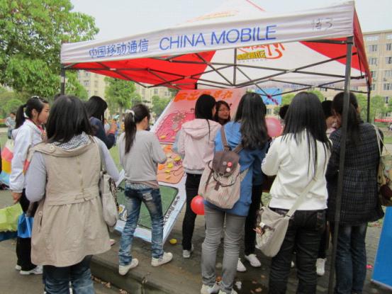 此次活动的展板是由杨奇和李亚茹同学共同完成,叶睿和吴垠同学负责音频的制作。由班级几名男生抬展板,女生现场吹气球,布置活动现场。一切就绪后,本班同学纷纷在便笺上写下自己的幸福晒在展板上。随后在缓缓的音乐声中,大家纷纷向路人发起了“攻势”。
