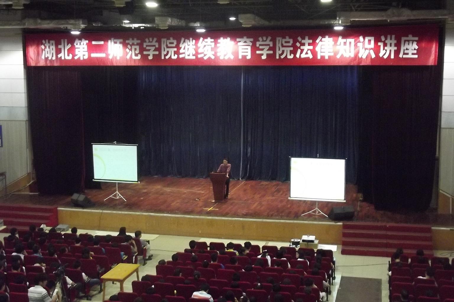 (本网讯 通讯员王晓雨)2012年5月21日下午18:20,继教院在校大礼堂举办了法律知识讲座,针对学生日常学习生活中遇到的法律问题,特邀请到湖北第二师范学院政法系讲师、湖北诺亚律师事务所律师朱睿为同学们讲解法律知识,来自全院的近千名学生聆听了讲座。