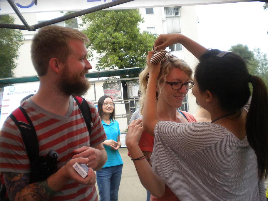 本网讯(大学生新闻中心 谢婷婷)“HI!What are you doing?”5月24日下午,在西区篮球场上举办的“校园爱心伞”活动义卖展台前,一群来自美国的观光客被11级新闻学女生热情的叫卖声吸引,在学生导游的帮助下,他们了解爱心活动,与同学们亲切沟通,其中一位旅客还买下 “扑克牌”和“发箍”送给他美丽的妻子。临别时,他们为场上女孩合影,“We will come back again, very glad to be here and meet you lovely!”(编辑 王璨)
