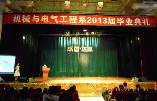 本网讯(通讯员 伍相琴)“机电师生聚,最恨离别意,感恩校园情,远航与梦飞”。6月25日下午两点,机械与电气工程系2013届毕业生主题为“感恩、远航”的毕业典礼在大礼堂隆重举行。系党总支书记陈新华,系主任王志民、副主任姚桂林等出席活动。