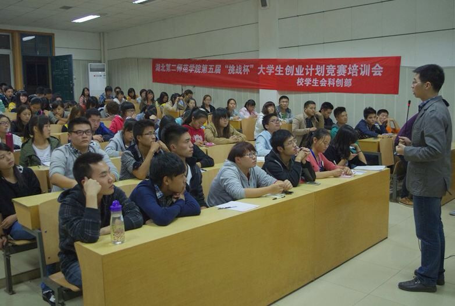 本网讯(见习记者 彭婉婷)10月28日18时30分,我校第五届“挑战杯”大学生创业计划竞赛交流会在我校大学生创业中心阶梯教室7举行。党委学工部创新中心主任、校学生会秘书长刘兴、大学生创业俱乐部部长李明亮、上届“挑战杯”大赛银奖获得者李建彪、李晨出席本次交流会。