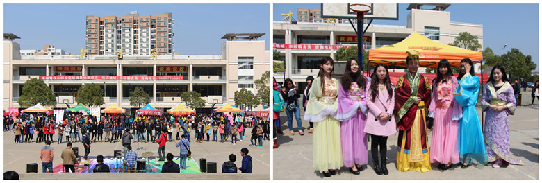 在西区篮球场上,首先最吸引人的是化生学院的乐队表演,他们个个激情澎湃,引得许多路过的同学围观。还有文学院的“寻找绿色幸运女生”活动,奖品是女生们喜欢的玫瑰花、娃哈哈等,更有计算机学院的猜成语,教育科学学院的跳绳,经济与管理学院的蒙眼吃水果等趣味横生的小游戏,以及艺术学院的汉服,都吸引了同学们的驻足。不少学院还设有心愿墙,供现场的女生们写自己心中的小愿望,可谓精彩纷呈。