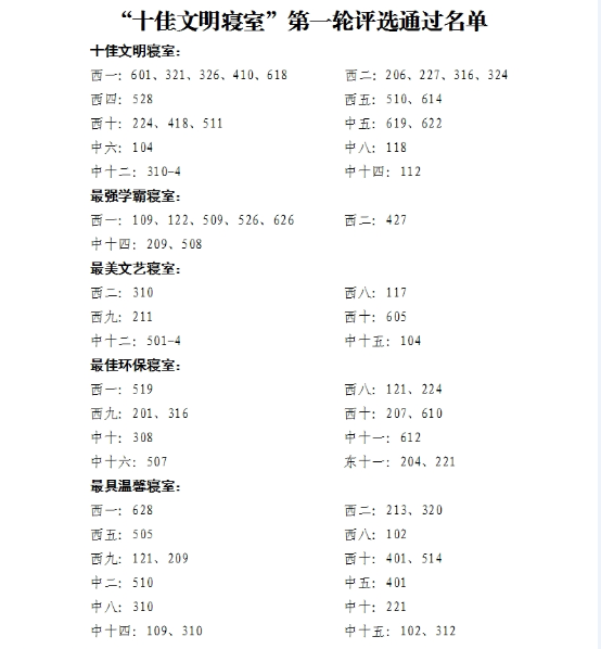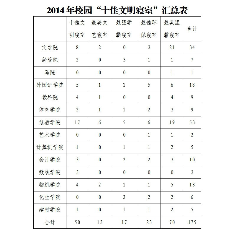 我校2014年校园“十佳文明寝室”评选活动正在进行,全校各院共有175个寝室参与。现将第一轮评选结果公告如下: