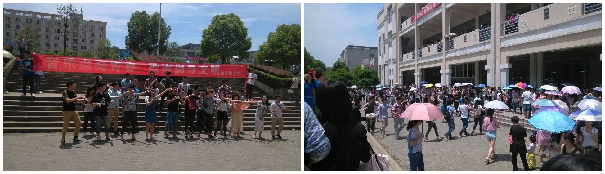 本网讯(通讯员 吕曼琪)红色五月,青春飞扬。为了给今晚拉开决赛帷幕的校园十大歌手加时赛打气,我校校学生会邀请第十届“校园十大歌手”入围候选人和艺术学院音乐专业的同学,于5月12日中午在西区楚才源食堂门前举行了一次“音乐点亮青春,文明倡导校园”的“快闪”活动,吸引了大批同学前来围观。