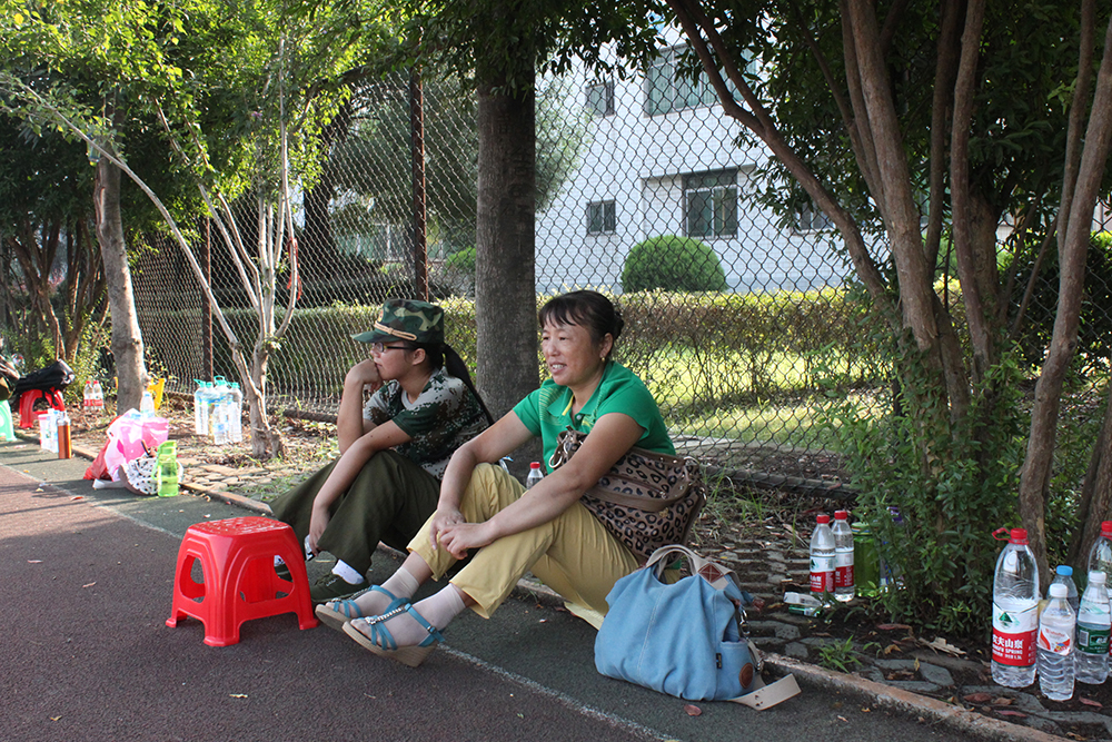 记者在军训场地观察到,有十几位新生家长昨天送学生过来报道后,并没有急于返程,而是留下来陪同自己的孩子参加第一天的军训。来自陕西的王阿姨人站在阴凉地,可是眼神却是一直追着场地上孩子的身影,据王阿姨介绍,她2号就送孩子过来报道,帮孩子处理安排好一切后仍旧不想立刻离开,不放心身体较差的孩子参加军训,一定要看一天才能安心回家。同样来自外省,甘肃的李叔叔夫妻两人也是不放心孩子,他们除了在场地陪同孩子,还买了一箱矿泉水免费发放给军训的学生。李叔叔说:“孩子们军训挺苦的,虽然看自己孩子晒太阳心疼,可是这也是对他们的一个锻炼,强身健体嘛,我们还是挺支持的。”