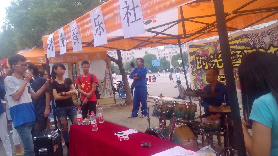 本网讯(通讯员 章莉 记者 张一帆)9月25日为我校社团招新第一天,在各大社团绞尽脑汁想办法吸引新生时,一位穿着蓝色制服的“沧桑”大叔悄然坐在了时光音乐社鼓手的座位上即兴演奏,赚足了同学们的关注。