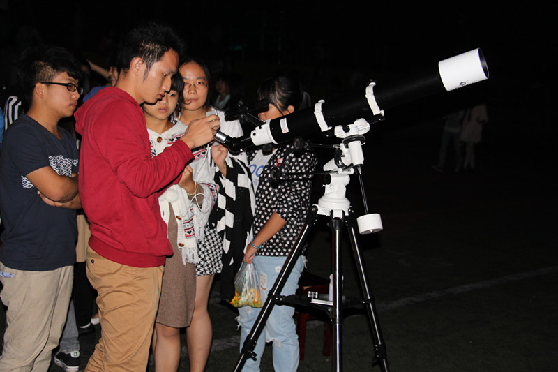 本网讯(青媒记者 王谋清) “ 哇!这是你自己买的望远镜吗,我可不可以看看月亮。” 10月8日晚,天空出现了月全食天象,来自计算机学院的祝小伟带来自己的天文望远镜早早赶到足球场,等候这一罕见天象,吸引了不少同学前来围观。