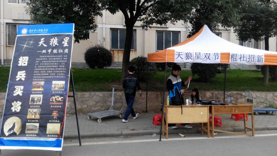 据了解,天狼星双截棍社是于2008年成立的,距今已成立6年了,然而,今天所招人数却是最少的一年。刘升说:“这次招新情况不理想的原因有三:一是招新地点不给力,被安排到最后的位置上;二是学校禁止发宣传单、挂横幅,宣传程度大打折扣;三是大家对双截棍的认识有偏差,将体育武术和文艺表演弄混淆了。”