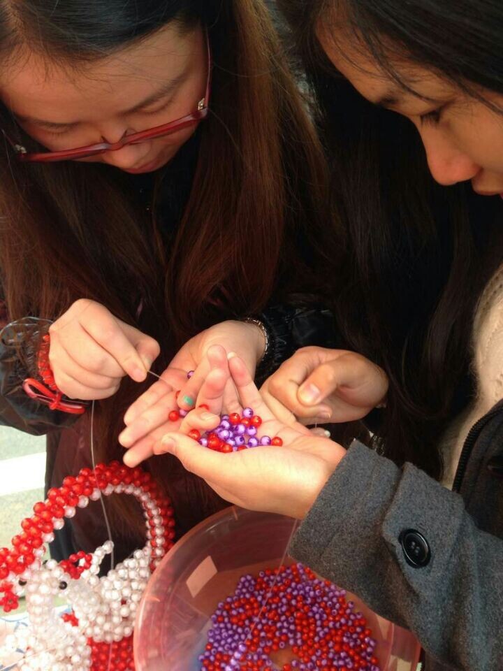 爱心工艺社为宣传此次活动特意制作了10多个原创大型巧串工艺品和许多小型爱心巧串作为小礼品。由于天公不作美,此次活动无奈在小雨中进行。但这并不影响学生们对此活动的热情。寒风中社长亲自教学并组织展开游戏,