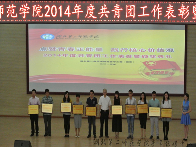 随后,主持宣读了《关于表彰2014年度共青团优秀集体和优秀个人的通知》,会上对获得省级“优秀共青团干部”和“优秀共青团员”荣誉称号的个人进行了表彰,对获得校级“五四红旗团委”、“十佳团支部标兵”、“教师共青团干部标兵”、“十大青春榜样大学生年度人物”等荣誉称号的先进集体和个人进行了表彰。校领导分别为获奖的单位和个人颁发荣誉证书并合影留念。