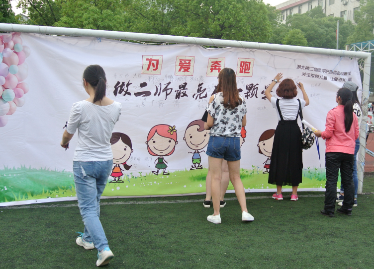 活动还未开始,足球场上的签名墙便吸引了一大波同学的眼球。参与者们纷纷在签名墙上,签下自己的名字,“做二师最闪亮的星”,为这场公益活动奉献自己的爱心。本次活动准备了一系列的荧光装备,包括荧光棒、荧光头饰等,希望能够借此吸引更多同学参与进来。