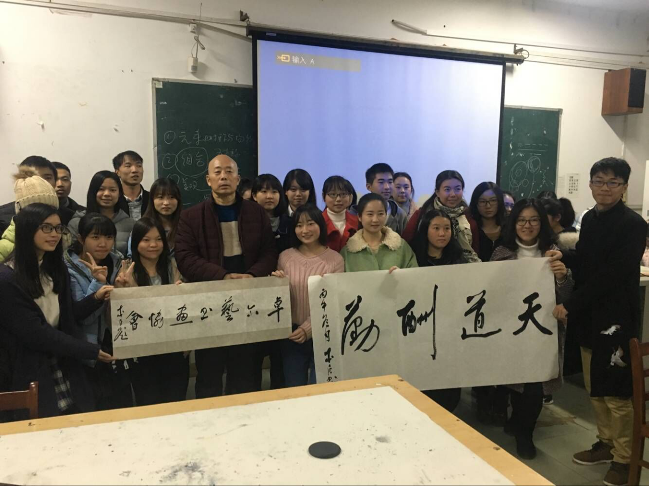 活动开始苑老师为社团成员介绍了书法入门的一些注意要求,他强调,中锋运笔,尽量站着写。另外,苑老师还告诫社团成员们要讲求基础扎实,建议从楷书基本笔画练起。卓尔艺书协会成员们竖耳倾听,听后纷纷点头表示赞同。活动中间,苑老师还点评了几幅卓尔艺书协会成员自己的作品,苑老师点评一针见血,点出社团成员的不足并提出解决方案。交流会尾声,苑老师给卓尔艺书协会题字“天道酬勤”以勉励社团成员,并合影留念。