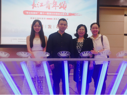 我校文学院副院长陈瑛、播音与主持专业指导老师陈欣、第十届“金话筒”大赛优秀选手程欣然参加此次发布会,并与湖北省演讲协会副会长兼秘书长曹辉合影留念。