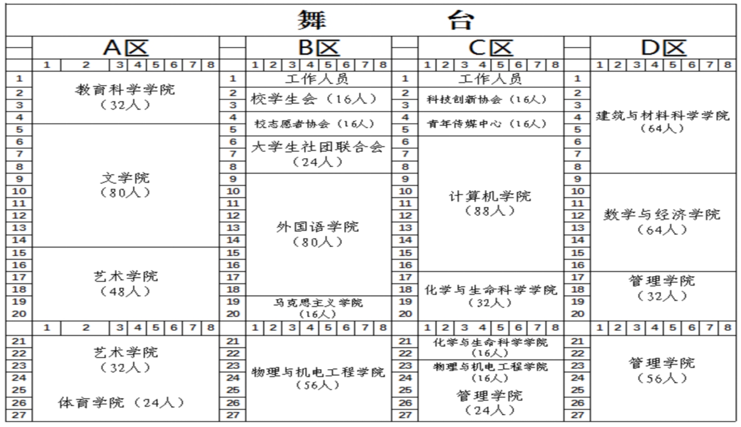 1.根据各个学院人数比例、主要学生组织人数进行名额分配(详见附件1)与座次安排(详见附件2)。请各学院、各组织统计观影人员名单(姓名+学号)与1名负责人及其联系方式,以Excel表格形式于2018年10月17日17:00前发送至hbesxtb@163.com。