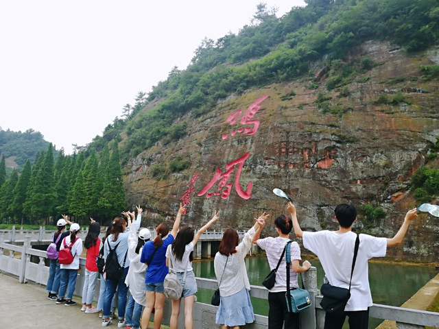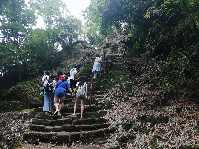 迎着蒙蒙细雨,踏着长着青苔的石阶,队员们来到鸣凤山,一起有说有笑。鸣凤山的山路几近垂直,大家都是手拉着手,一边唱着红歌一边携手前行。