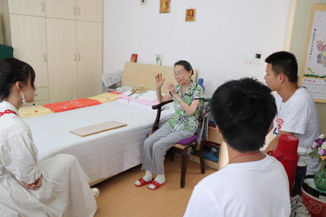 本网讯(通讯员 胡雨青 赵欣可 龚震 何苗)7月9日,我校“情系荆楚,爱满家园”志愿服务队来到荆州市沙市区海宏达养老院,与居住其中的北京林业大学老教授徐明惠亲切交谈。
