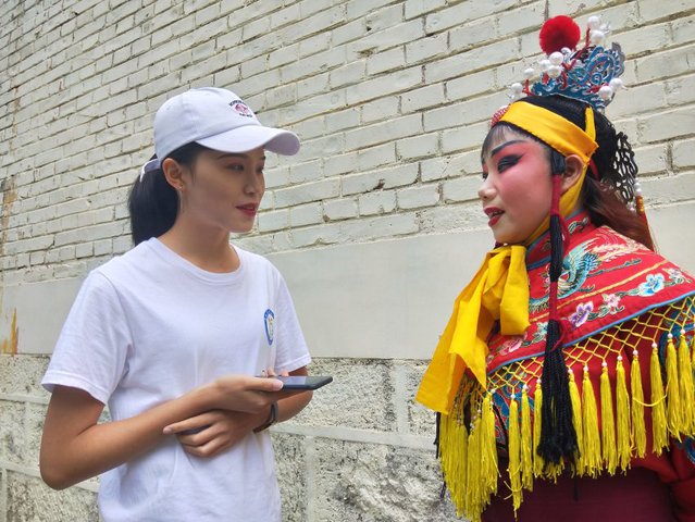 图为团队队员采访剧目《明公断》皇姑扮演者