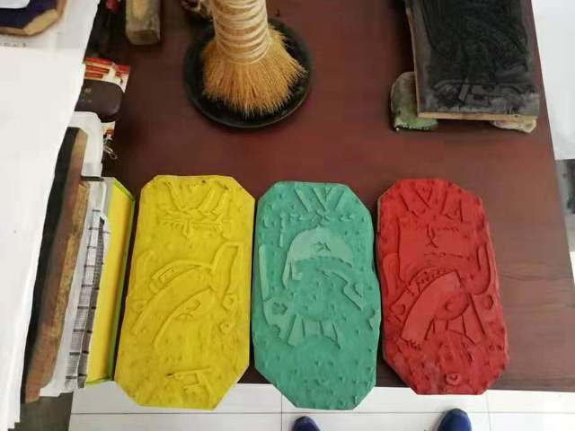 我们从陈太口中得知:木版年画的制作极为复杂,基本采取套印的方式,这也是其区别于一般彩绘年画的显著特点。所谓“套印”即无论彩色还是黑白,都是先在梨木板上用工具雕刻出反方向的图案,待雕刻成型以后,让木版吸满墨汁,涂抹均匀后将宣纸的光滑面轻放于木版之上来回摩挲即可印出黑白的作品。而彩印的制作流程则更加繁琐。根据梨木版上雕刻的形象,需要先想好整幅画总体的色调色系,以及不同部位的颜色布局,再另取若干木块对照着先前木版上的图案在新取的木版上雕刻出需要上同种颜色的部分,并将该木块涂上相应的颜色。全部的颜色都备齐以后再一块一块地印到第一块木版所印出的轮廓中。