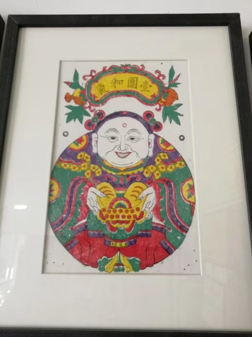 在陈太的讲述中,我们了解到:传统的老河口木版年画主要以历史故事、民间传说为题材,大多表现百姓对于先贤的尊重以及对于美好生活的向往。如今店内墙壁上悬挂着的多为关公、钟馗之类的人物形象画,同时也不乏门童之类的喜庆形象。最为出名的要数那幅《一团和气》。整幅图画的基本都以圆形为主打形状,毫无僵硬刻板之感。