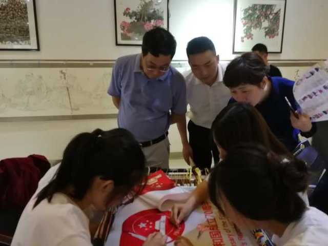 区委领导对青年大学生暑期学习汉绣,传承传统文化表示高度认可,并表示“这么大一幅汉绣作品,费心费神还费眼睛,孩子们还能做这么好,不容易!”领导们在队员们周围围观驻足,与队员们深入交流,询问了刺绣的时间,在刺绣过程遇到的困难等问题。了解相关情况后,领导们祝福实践团队队员们并表达了对作品的期待。
