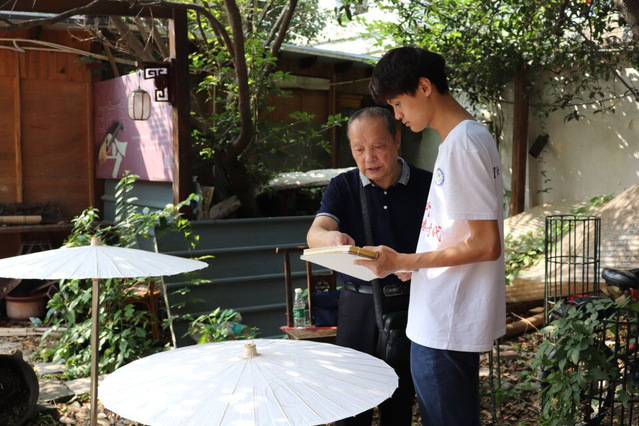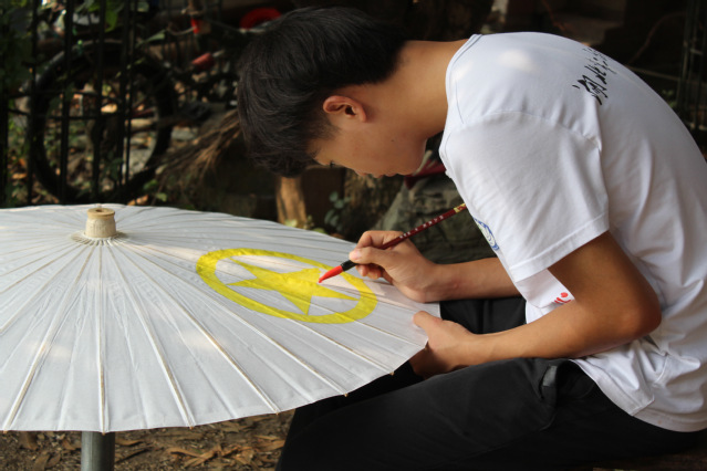 和“苏恒泰”油纸伞第五代传承人苏峰沟通后,队员们带着画笔颜料和伞面进入工作室后院,着手在伞面上作画。