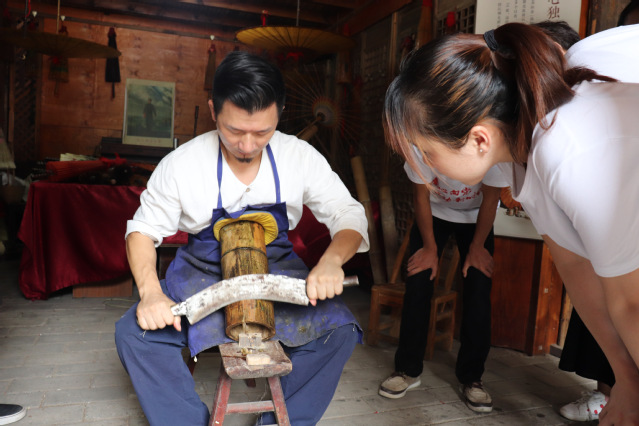 一个直径约20厘米的圆,王华杰用了大概20分钟才完成。汗水不断滴落在伞面,王华杰丝毫没有注意到。“伞面凹凸不平,画的时候要更仔细,耐心很重要。”王华杰介绍道,伞面是用牛皮宣制成,比一般的宣纸要结实,即便如此,把伞撑开作画时依然要很小心,如果用力过大,伞面就会被戳坏。小小的一把油纸伞,却需要七十二道工序。这其中不仅包含了油纸伞制作匠人的精益求精,更包含了中华文化的博大精深。
