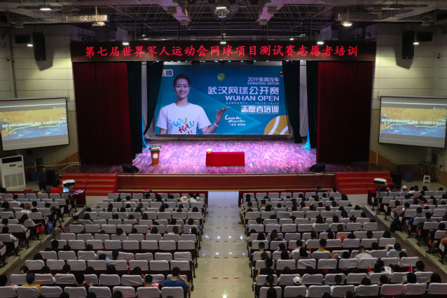 本网讯(青媒记者 郭雨彤 温静怡)8月31日-9月1日,第七届世界军人运动会网球测试赛暨武汉网球公开赛志愿者培训会在我校举行,来自武汉各大高校的700余名志愿者共同参加此次培训,此次培训的目的是为了更好的推动将于9月20日-28日举行的2019年武汉网球公开赛赛事志愿者的实战演练工作。