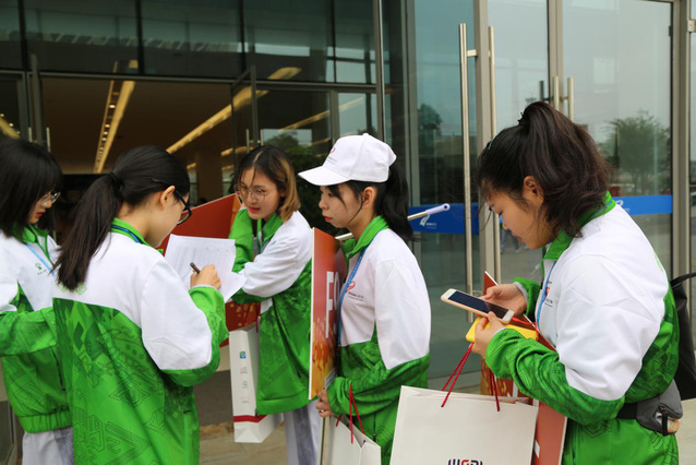 图为F计划的志愿者们在比赛前在赛场外进行准备工作,并进行签到。