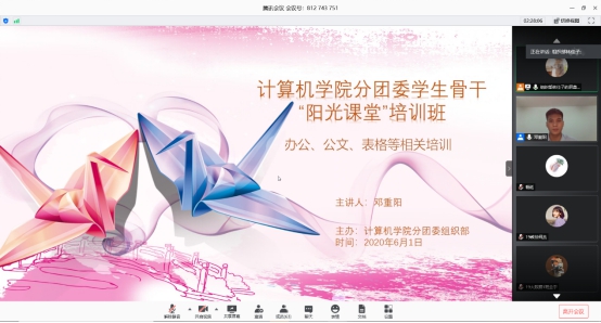 本网讯(通讯员 肖沫晔 记者 王姝婷 杨延)6月1日19时,分团委学生骨干“阳光课堂”培训班培训于线上顺利举办。课堂以常用办公软件培训为主题,辅导员邓重阳负责主讲。19级全体团支书、学院各学生组织负责人以及部分干事参加此次培训。