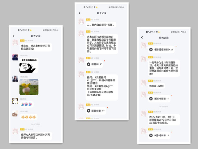 6月8日下午开营仪式上,群内气氛十分热烈,同学们在肖沫晔的指导下认真制定各自的两周复习备考计划。开营后,群内每日提问答疑、组织开设网络自习室、统计打卡完成情况,秩序井然。当然,初任营长的杨锦琳也会碰到许多组织工作上的困惑,经过思考、请教老师、协商沟通其他运营团队成员,最终都顺利解决。一周复盘时,肖沫晔和杨锦琳提前制定会议流程,组织9名学习督导员单独复盘演练,同时讨论学习营制度完善方案。