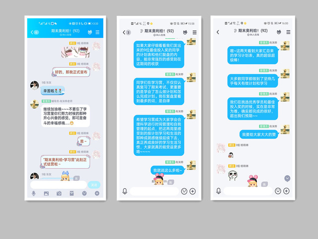 学习营开设两周,在期末考试周开始前正式结营,营内“玩法”很丰富。有每日制定学习计划加群内打卡;从各班中寻找“学霸”作为课程答疑人,学习营群内可以自由提问和答疑;每日开设网络自习室,营造一起学习良好氛围,自习室内还设置专门课程答疑和讲解;一周一次学习复盘,回顾一周学习情况。学习营还设置奖项,优秀学员(计划完成度最高)3名,最佳投入(复盘记录最认真)奖3名,最爱思考(群内提问次数最高)奖3名,最佳助人(答疑次数最高)奖3名。