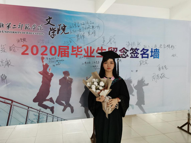 文学院16汉语言2班许嫣然身着学士服在学院大厅与签名墙合影。