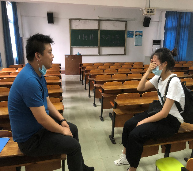 迎接现场,返校毕业生由“一对一”教师进行引导办理离校手续。在迎接现场有很多师生拥抱告别、交心谈话。其中“师友·学友行动”对接部门——教务处、质评处的领导与毕业生交心谈话,询问学生的近况,如升学、就业等方面的情况。