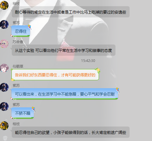情绪组本次线上辅导以“情绪的自我认知”为主题,志愿者首先将不同的情绪词汇发给“平民”和“卧底”,通过“谁是卧底”的游戏帮助学生理解各情绪的深层含义及不同情绪间的异同。随后,志愿者向学生们介绍著名的心理学实验——“软糖实验”,加深了他们对有效控制情绪的优点的理解。