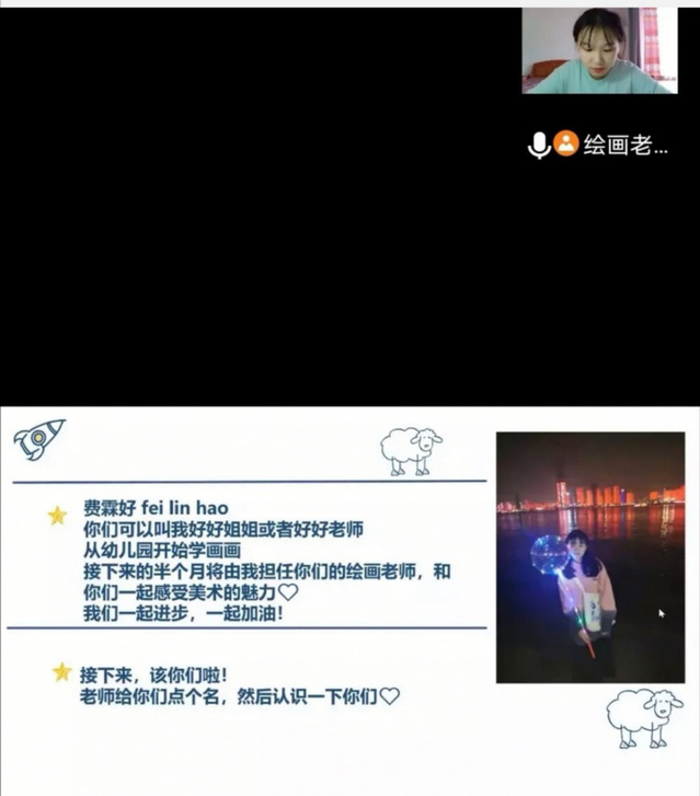 既然身负重任,自己又有一腔热爱,我就必须把这件事做好。身为绘画老师,在上课三天前我就开始备课,我先去学习了适合二、三年级孩子的教学方法,找到适合二、三年级学习的简笔画,自己先画好,然后拍照放在PPT里。在正式上课时,我提前半小时开启腾讯会议,让孩子们先进会议室,和他们聊聊天,认识一下他们。因为是第一次教书上课,所以尽管我准备的很充足了,但刚开始和他们聊天的时候我还很紧张,有点语无伦次。孩子们都非常可爱,也很积极与我互动,刚一打开摄像头,一个小女孩就说:“老师,你好漂亮啊。” 他们一声声互动和回应让我不再紧张,很快的就进入了课堂的氛围。