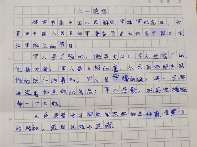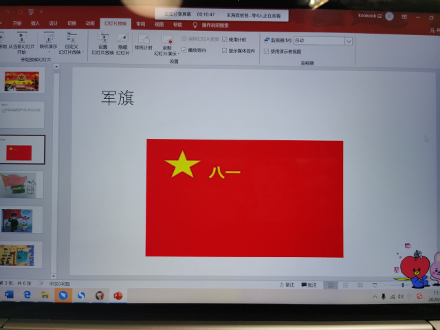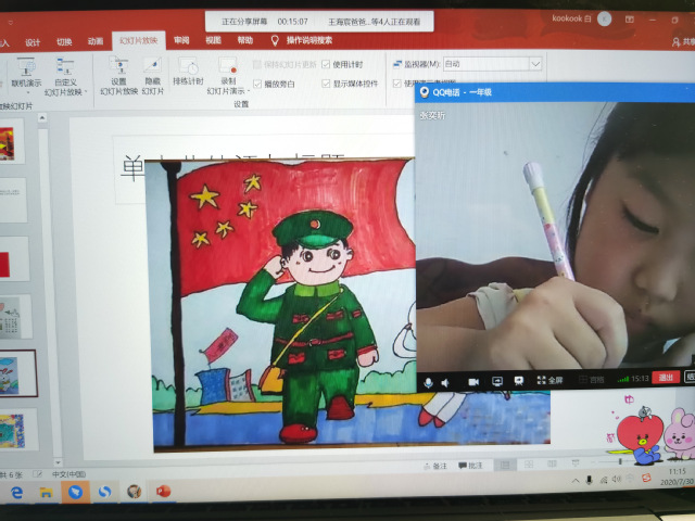 本网讯(通讯员 王玥)8月1日,湖北第二师范学院“八系宜都,情暖清江”实践队在线上开展了八一建军纪念活动。首先,学生观看了关于解放军的电影,在观看电影的过程中,学生感受到了革命战士舍己为国的精神。接着,志愿者和学生一起合唱了《我和我的祖国》,并且朗诵了《少年中国说》在合唱和朗诵的过程中,学生感受到了战争时代革命战士舍己为国的精神以及奋起反抗的少年们的伟大愿望。随后,学生写下了活动感悟并且以绘画的形式致敬解放军叔叔。