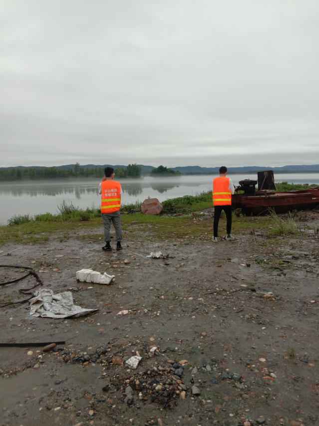 图为志愿者正在江边查看“禁渔”情况。