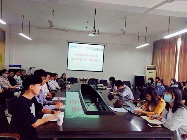 本网讯(通讯员 李雅晴)为了充分了解管理学院2020级专升本学生入校学习生活情况,促进这一批“特殊新生”,尤其是针对首次考入我校的学生能够更好地融入学院,适应学校在思想政治教育、常规事务管理、学风建设和常态化疫情防控等方面的要求。9月17日下午,管理学院于二号教学楼三楼会议室举行了2020级专升本学生骨干入学教育专题座谈会。管理学院分党委副书记刘兴、学工办主任、分团委书记周慧东及辅导员参会,叶莹主持会议。