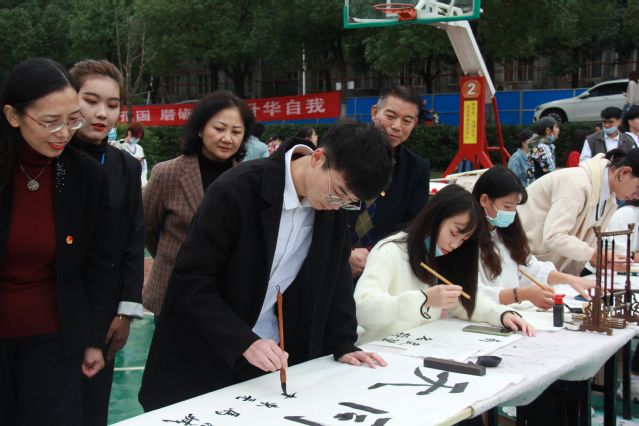 本网讯(青媒见习记者 钱奕 王可心)10月7日12时30分,我校“以‘文’战疫,青春聚力”校园文化艺术节之秋季校园书画展在西区篮球场顺利进行。校党委宣传部常务副部长方喻,校党委学工部部长金殿中,校团委书记文敏,艺术学院分党委书记雷静和,艺术学院分党委副书记夏永祥,艺术学院院长金波,艺术学院副院长刘畅出席本次活动,部分校团委、艺术学院分团委的各位老师以及学生代表也参与活动。