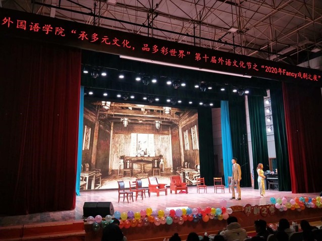 本网讯(通讯员 甘晓雨)11月25日,外国语学院“承多元文化,品多彩世界”第十届外语文化节之“2020年Fancy戏剧之夜”在学校大礼堂顺利举办。本次活动主要由外国语学院Fancy戏剧社承办,戏剧社成员郭顺东、汤亚茹主持。演出剧目有英文剧《忽然某一天》和中文改编剧《金锁记》。