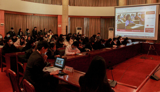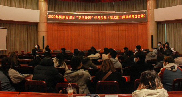 本网讯(青媒记者 杨梓秀 见习记者 陈实)为认真学习贯彻习近平法治思想,深入贯彻落实党的十九大和十九届五中全会精神,维护宪法权威,根据教育部工作部署,12 月4日国家宪法日当日,省教育厅组织设立主会场,开展全省教育系统“宪法晨读”活动,我校开设“湖北第二师范学院分会场”。来自校“青马工程”之第十三期“光谷英才”大学生骨干培训班学员代表、校级团学组织学生骨干、各学院学生代表等70余人于行政楼1号会议室通过视频接入,与全省大中小学生在不同的城市,不同的学校同时诵读宪法条文节选。分会场学习活动由第十三期“光谷英才”培训班团支书敖伟昊同学主持。
