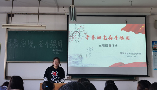 本网讯(通讯员 温洪胤)为带动广大团员认真学习“习近平新时代中国特色社会主义思想”,以良好的精神面貌迎接建党100周年,管理学院于3月22日中午在 2号教学楼开展 “青春向党,奋斗强国”的主题团日活动。活动由管理学院分团委组织部部长王钰主持。