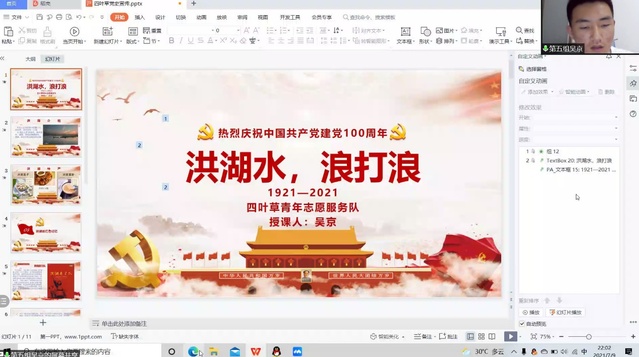 本网讯(通讯员 李玉玲)不忘初心、牢记使命。开展党史学习教育是推进中华民族伟大复兴的一门必修课。为了以更好的方式向支教地区的学生教授党史课程,在支教中给学生带来正确的思想启蒙,我校四叶草青年志愿服务队于7月9日晚21时在线上组织召开了党史磨课会议,完成了四叶草青年志愿服务队第三次即出发去支教地点前的最后一次党史磨课。本次会议由团队指导老师唐志强参与指导,团队队长潘亚玲主持会议,全体授课成员参与本次会议。