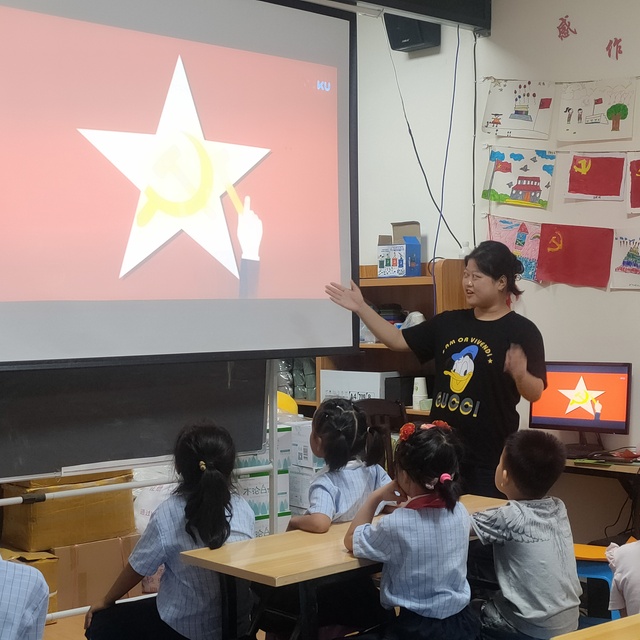 图为满天星志愿者在向学生讲解党徽的镰刀和锤子代表了什么,并为学生讲解了党徽在什么地方可以用,什么地方不可以用。