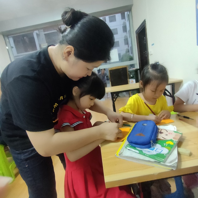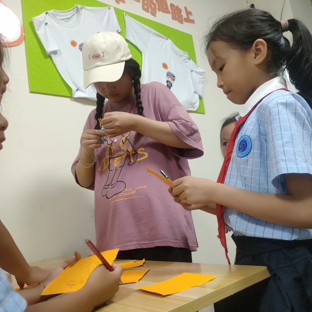 为了防止学生用剪刀时会伤到自己,志愿者便帮助学生把他们自己画出来的党徽剪下来。