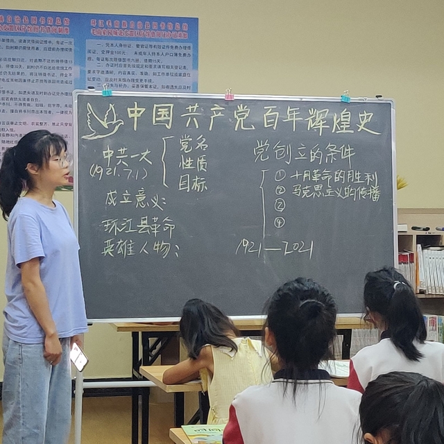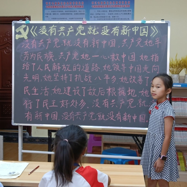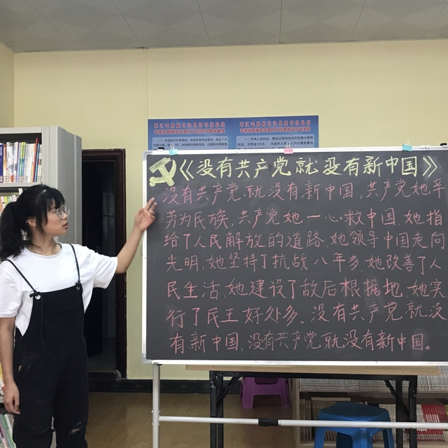 图为志愿者老师教学生吟唱《没有共产党就没有新中国》,意在中国共产党一百周年生日之际与学生一起为祖国百年华诞献礼。