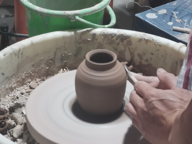 为非遗传承人赵师傅制作彩陶作品的细节展示。通讯员朱灿摄