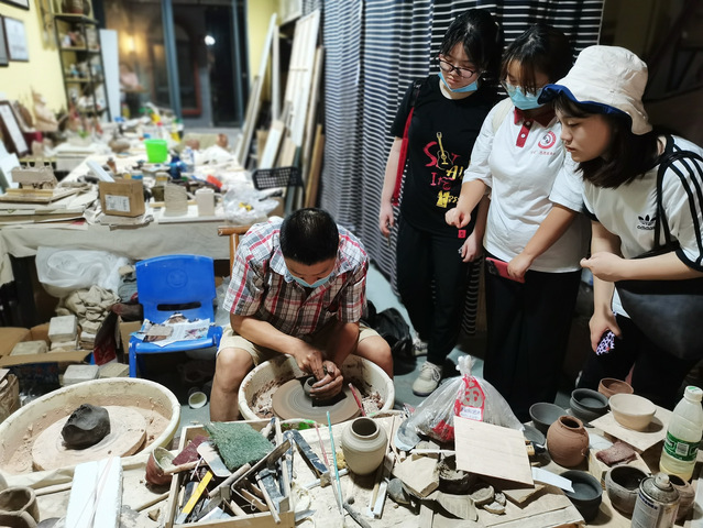 为实践队员认真听非遗传承人赵师傅讲解制作彩陶的相关知识。通讯员朱灿摄