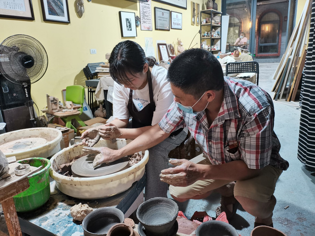 为实践队员在非遗传承人赵师傅的指导下学习制作彩陶。通讯员朱灿摄