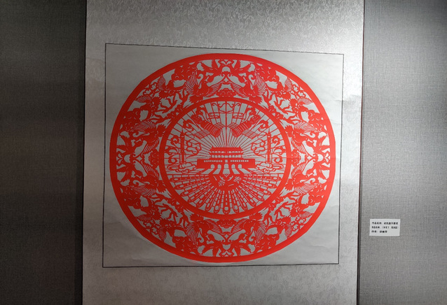 一进门,我就被各种精美的剪纸深深的吸引住。大家都惊叹于剪纸技艺的高超,纷纷驻足观赏,享受这场视觉盛宴。比如剪纸作品《厉害了,我的国》,中间部分是故宫,左右两边是正在发射的火箭,上面是两颗卫星,下面是高速飞驰的高铁,上面还写了“一带一路”,众多要素给我们展示了建党以来我国的伟大成就,展示了一幅国富民强的美好画卷。这也让我感受到了祖国的日益强大,而且我国提出的科技兴国并不是纸上谈兵,而是实实在在,脚踏实地的发展科技。